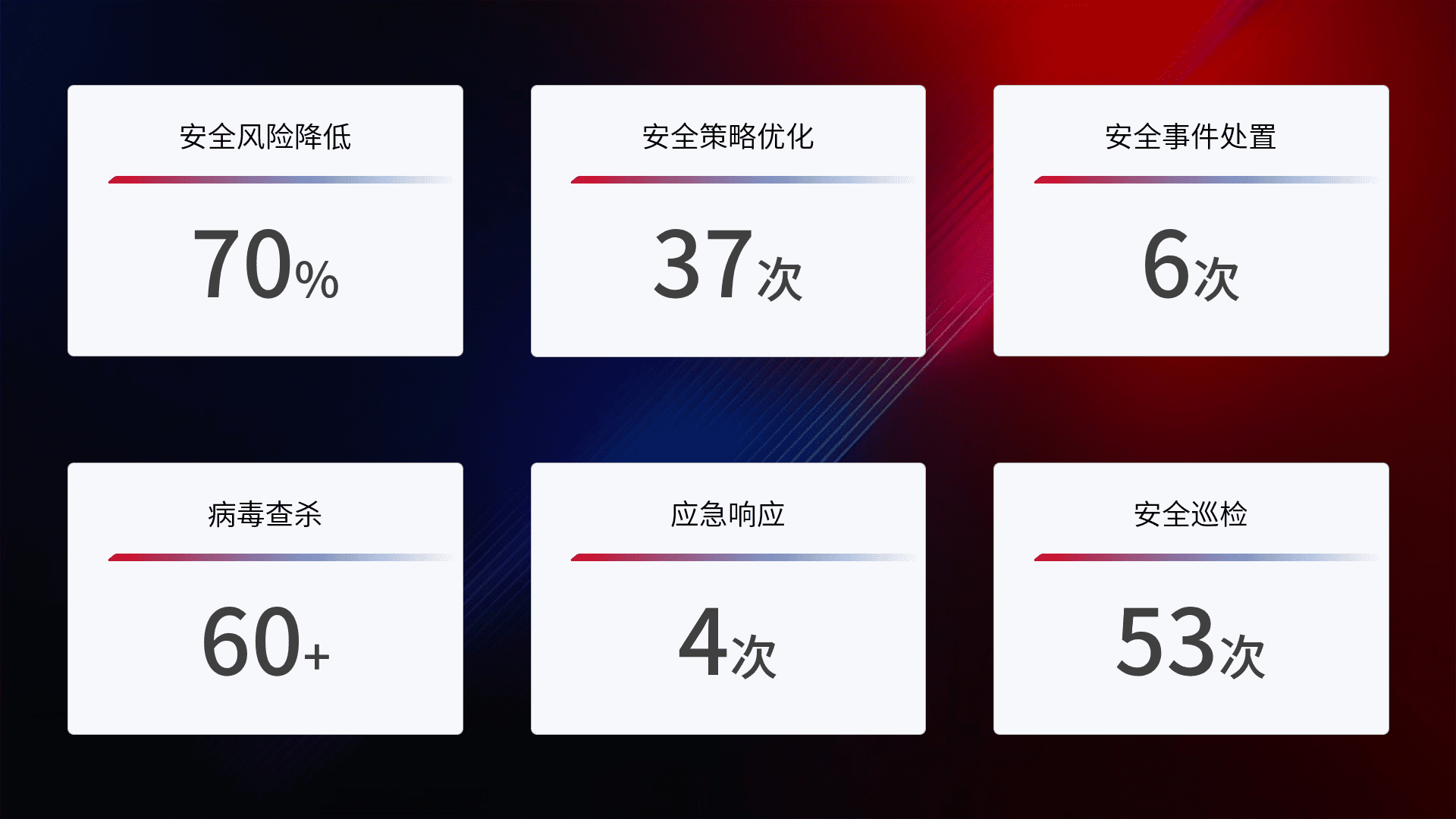 提供全面的安全事件报告体系,,包括处置报告、、、、周报、、、、季度和年度总结,,,结合持续监控,,,,帮助客户深入了解网络安全状况。。