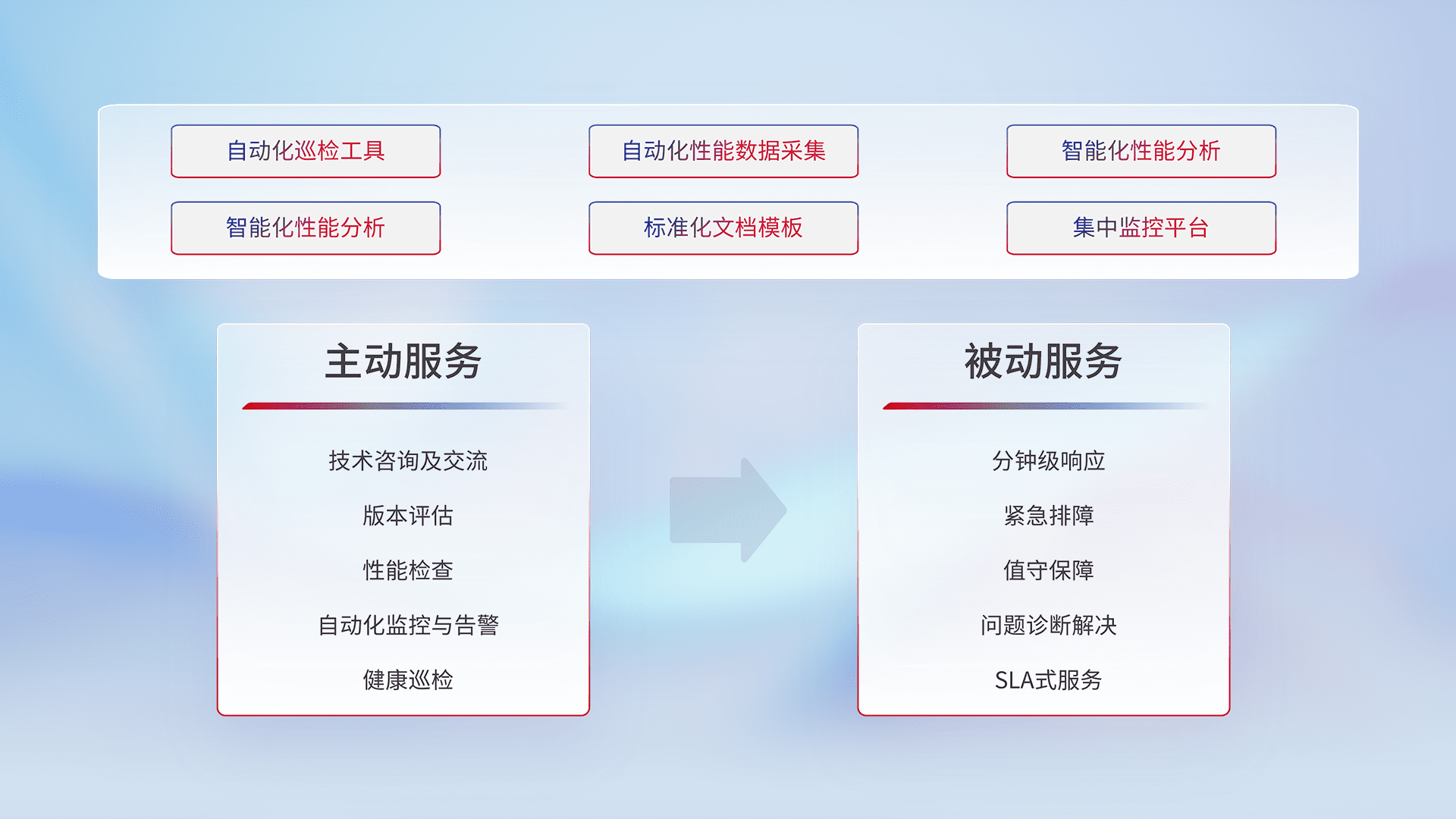 智能化工具和标准化文档,,,,保障服务质量,,,,提供主动服务(包含技术咨询、、版本评估、、、、性能检查、、、、自动化监控与告警、、健康巡检)和被动服务包含(分钟级响应、、紧急排障、、值守保障、、问题诊断解决、、、SLA服务)。。。